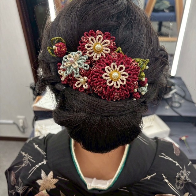 エンジをベースにした、成人式のお振袖や卒業袴にも似合う髪飾りセットです。 大輪のコームと、花束のかんざし、そしてUピン2本の、全4点セットになります。 浴衣などのカジュアルな装いには単品でお使いいただけます。 ※写真3枚目、4枚目の着画は色違いです。サイズ感の参考に。 【サイズ】 大輪花…直径約11センチ 花束…直径約8センチ 花びら1枚の長さ…約6センチ 揺れ玉の誰紐の長さ…5.5センチ〜7.5センチ