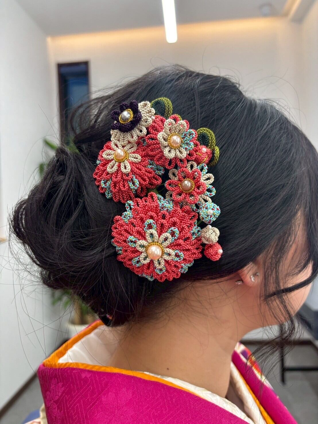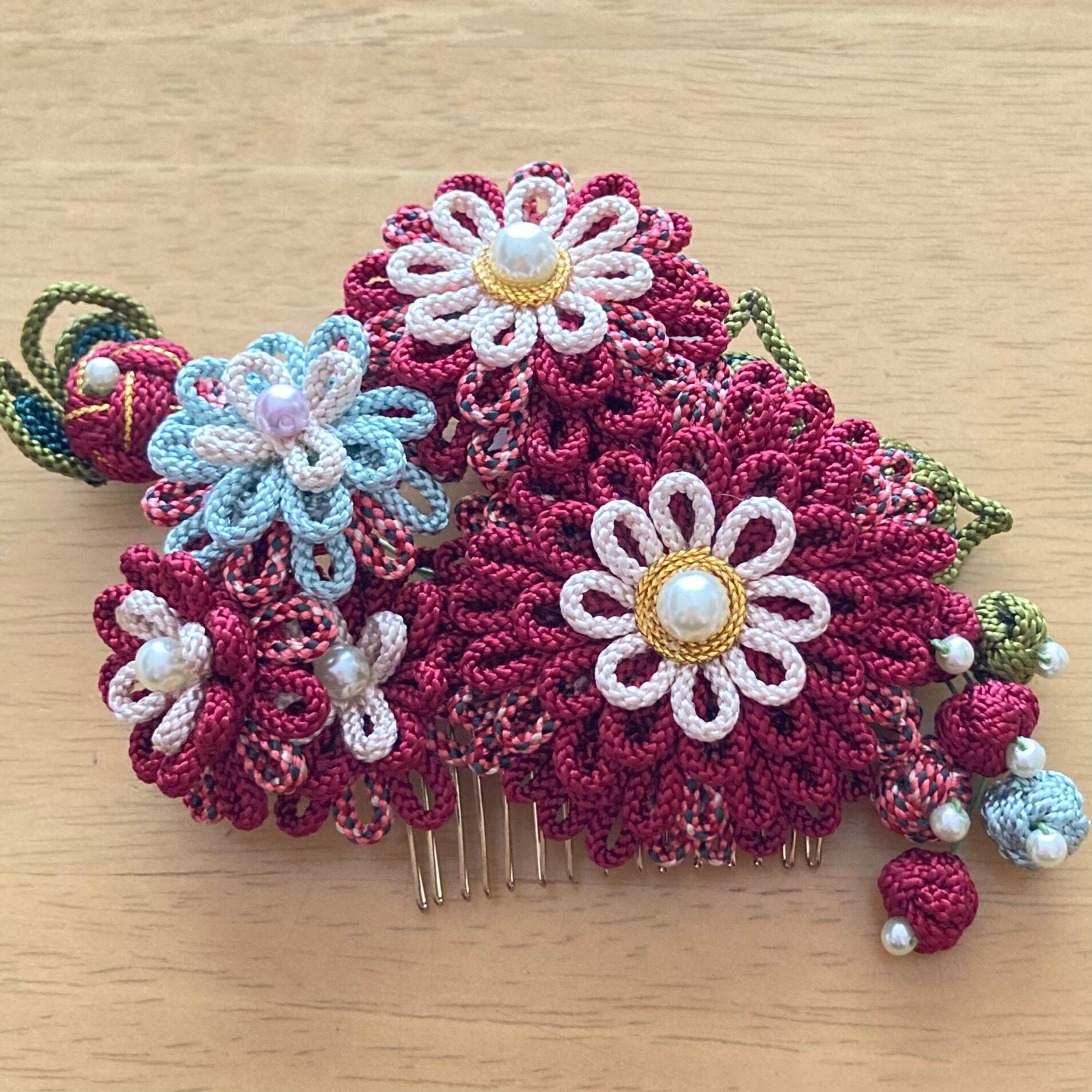 ※写真1枚目は、えんじの髪飾りを後ろにつけています。