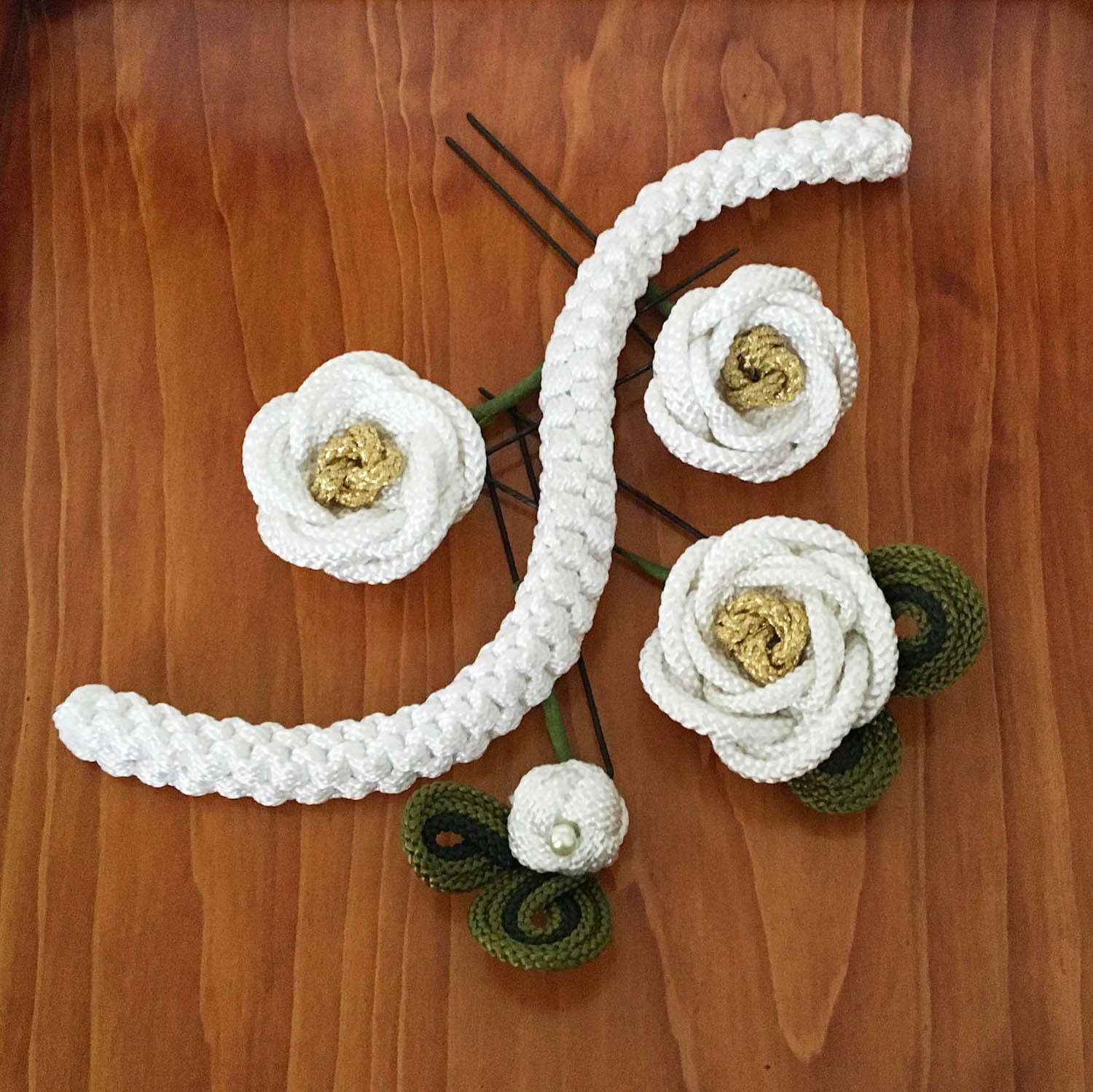 白い椿の髪飾り5点セット(葉付き椿1、葉なし椿2、葉付きつぼみ1、こうがい風飾り1)です。