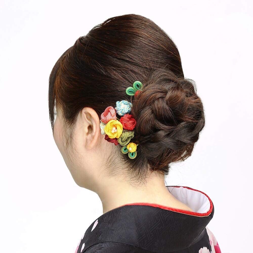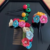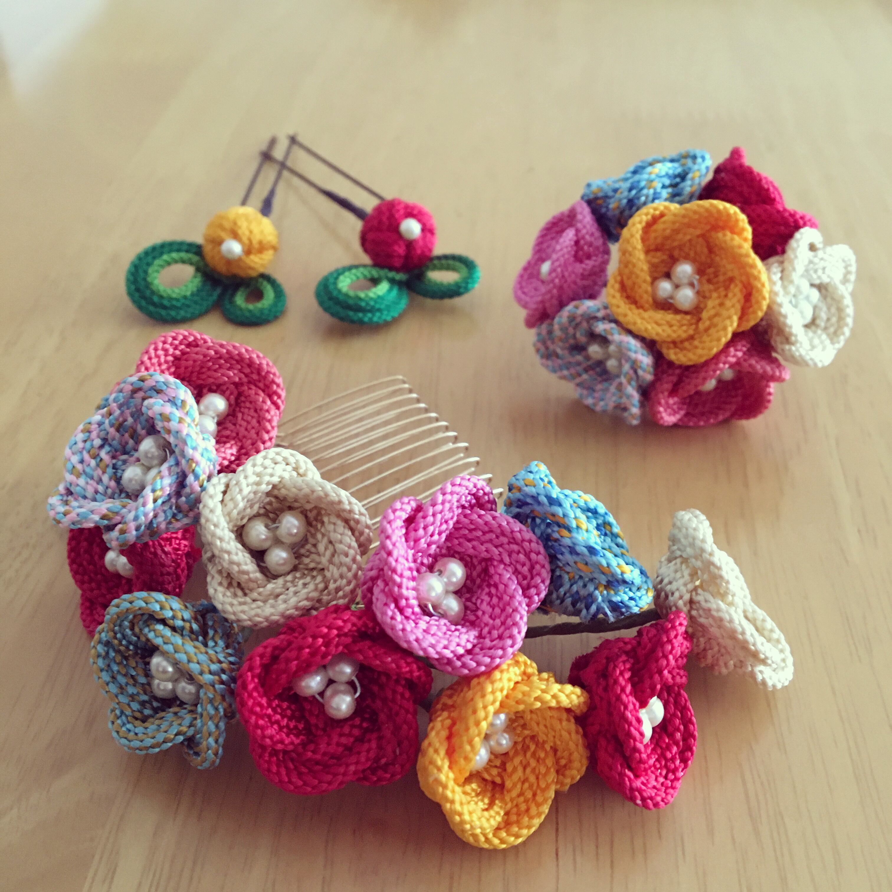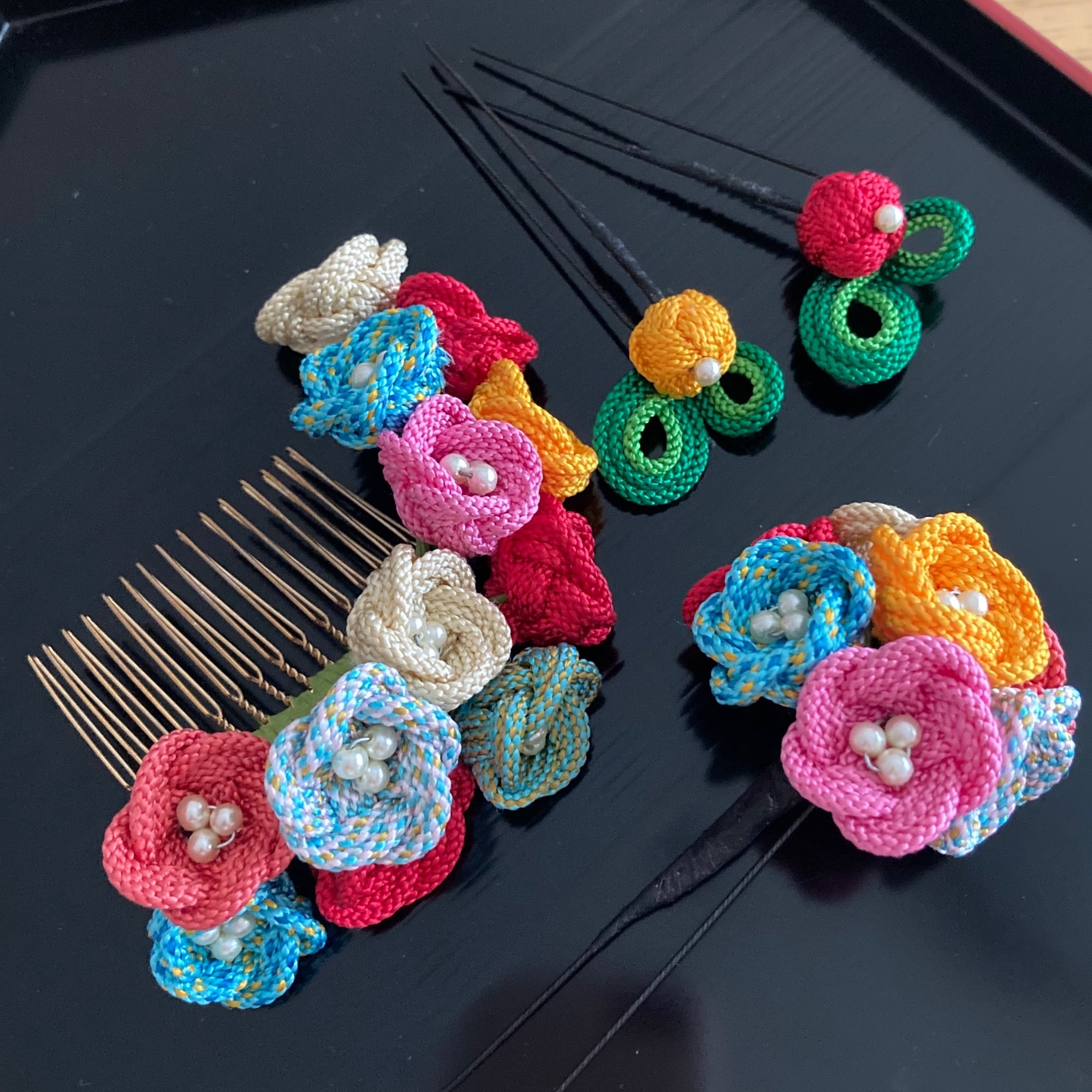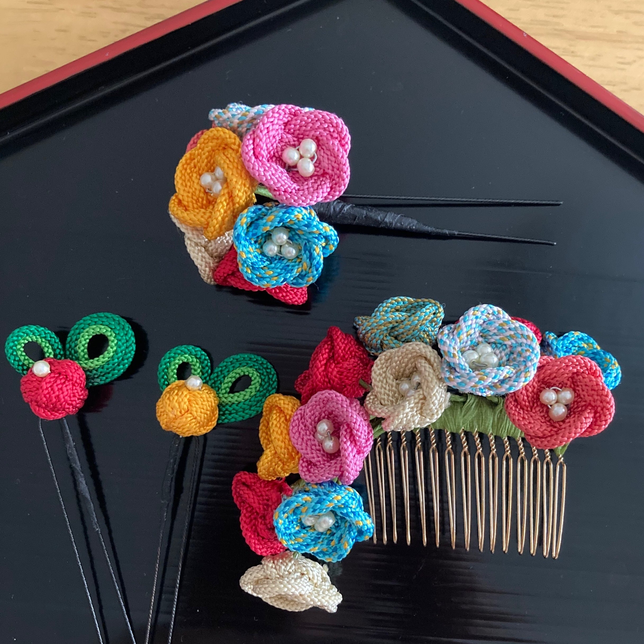色彩豊かな津久井紐で作った、七五三にも成人式のお振袖にも似合う髪飾りセットです。